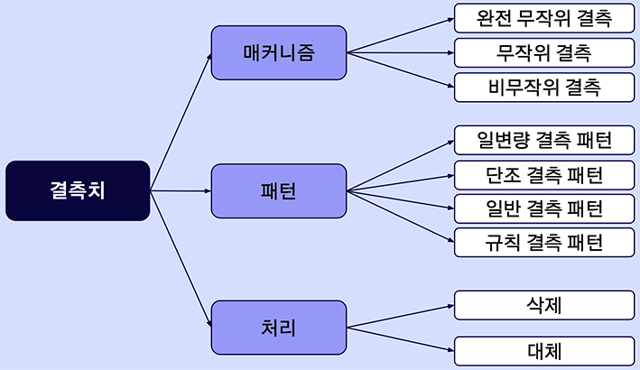 결측치는 다양한 이유로 발생할 수 있다. 설문조사에서는 응답자가 일부 질문에 답하지 않거나, 센서 장비의 오작동으로 데이터가 제대로 수집되지 않는 경우 등이 있을 수 있다. 결측치는 크게 세 가지 유형으로 분류할 수 있다: 무작위 결측(MCAR, Missing Completely at Random), 조건부 무작위 결측(MAR, Missing at Random), 비무작위 결측(MNAR, Missing Not at Random)이다. 이 세 가지 유형은 각각 결측치가 발생하는 원인과 그 특성이 다르며, 결측치 처리 전략을 선택하는 데 중요한 역할을 한다.