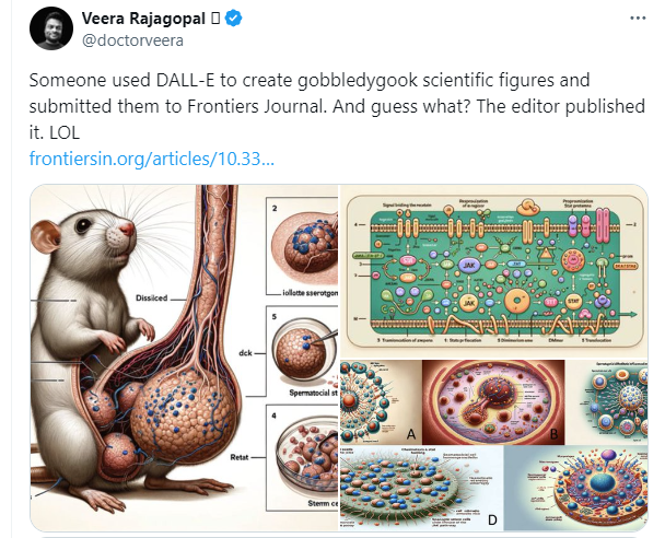 실제로 지난 2월에는 중국의 시안 자오퉁 대학교와 시안 홍위 병원 연구진이 '세포 및 발생 생물학 프론티어'라는 과학 저널에 게재한 논문에 AI가 생성한 잘못된 글과 그림이 포함, 삭제되는 사태가 일어났다. 이 논문은 SNS에도 오르며 많은 연구자의 조롱을 받았다.