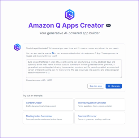 기본 코드나 프로그래밍을 이해할 필요가 없다. 아마존 큐 앱의 AI 어시스턴트가 모든 중요한 작업과 빌딩 작업을 수행한다. 예를 들어 사용자가 자연어 프롬프트를 입력하면, 문서의 문법 편집기와 맞춤법 검사기를 만들고 회사 스타일 지침을 사용할 수 있다. 이후 AI 어시스턴트가 업로드를 수행하고 애플리케이션을 생성한다.