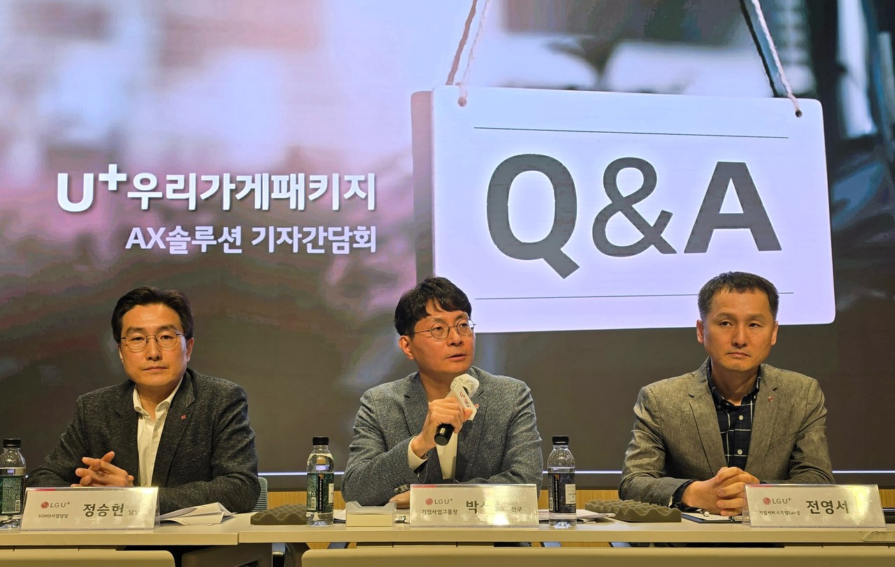 이날 서울 용산 LGU+ 사옥 대강당에서 열린 기자간담회에서 정승헌 SOHO사업 담당, 박성율 기업사업그룹 전무, 전영서 기업서비스개발 CTO 등이 등장, 소상공인들의 매장을 AI로 관리할 수 있는 솔루션의 기능을 설명했다.
